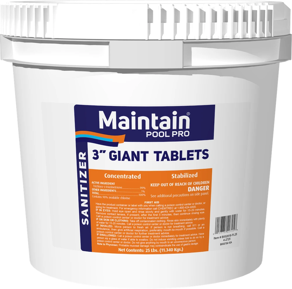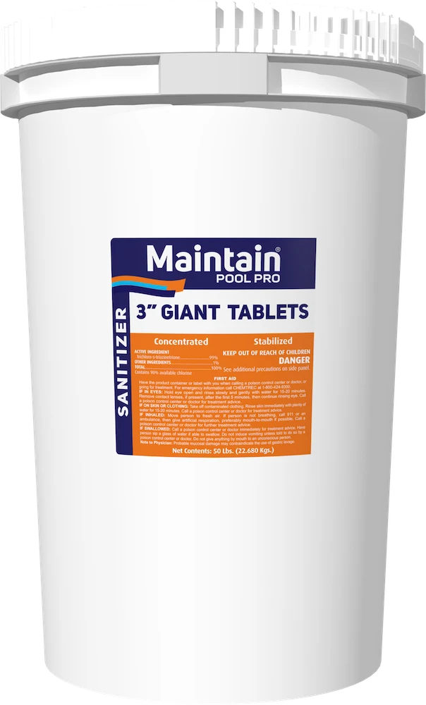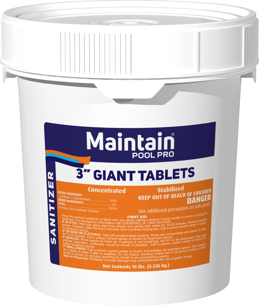 Maintain Giant 3″ Chlorine Tablets are slow-dissolving 8 oz. tablets that offer 90% available chlorine for effective sanitizing. This product is an ideal way to continually sanitize pool water. They are perfect for dispersing with floaters, automatic feeders, or skimmers. These large tablets dissolve slowly and at a uniform rate, eliminating the need for frequent hand feeding of granular or liquid chlorine. They are also stabilized against the sun’s UV rays which break down chlorine. Stabilized chlorine means less sanitizer consumption