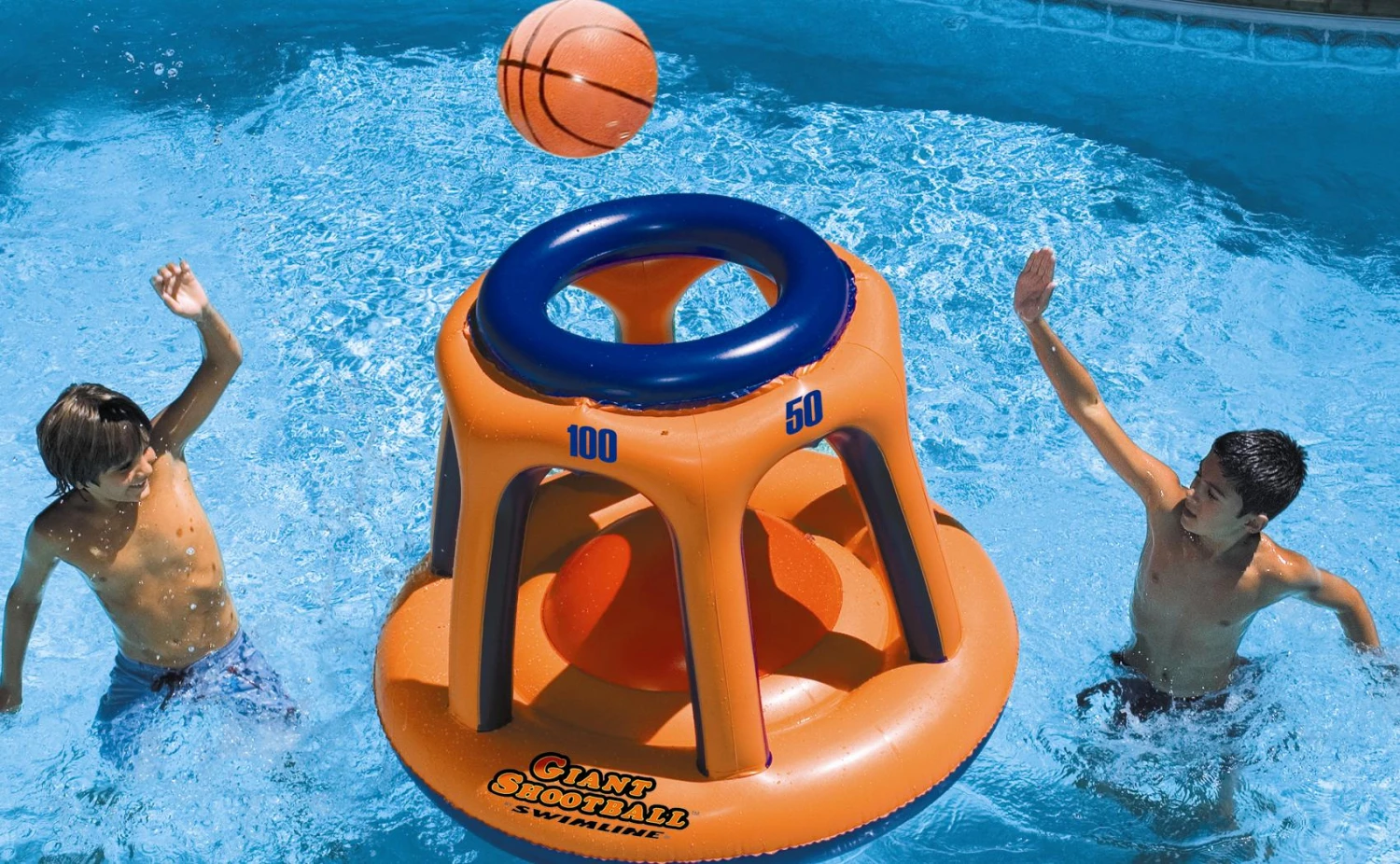 Giant inflatalble multi-port, multi-score basketball game. Live the game Large!! Test your skills and see who can get the highest score, it’s not as easy as you think. 48″ height, ball included. Larger than life basketball action for the swimming pool.