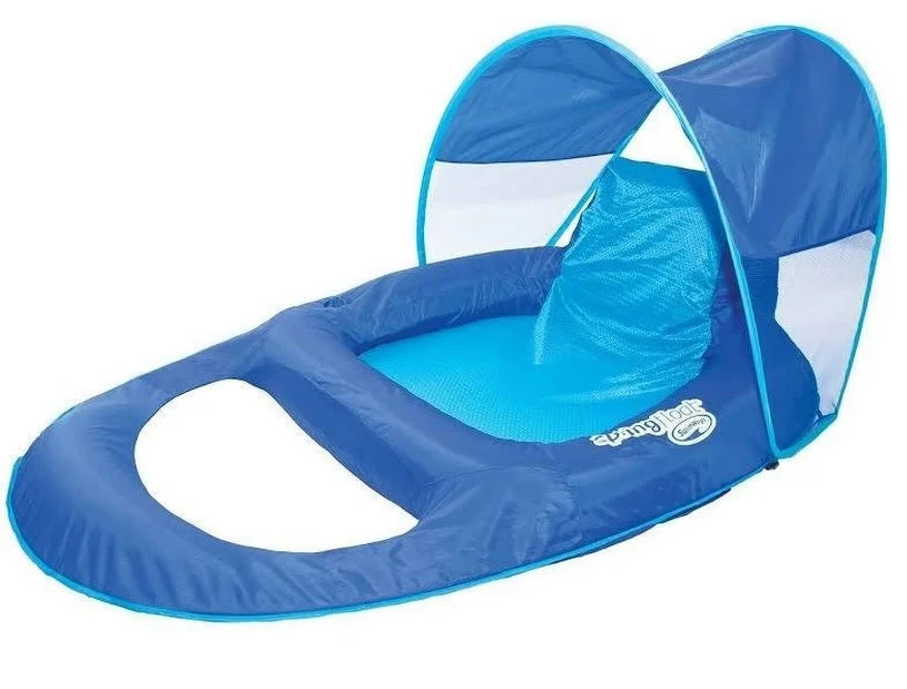 The SwimWays Spring Float Recliner with Canopy pool float combines all the comfort of the Spring Float Recliner plus added shade!