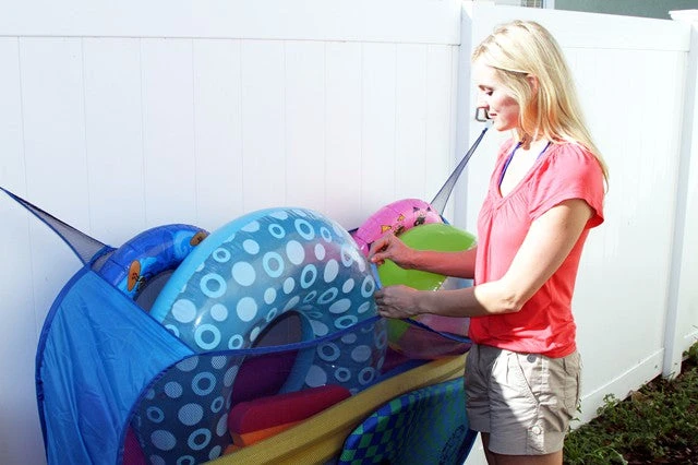 - An organizer that easily stores all pool, patio and backyard accessories, small toys, beach balls, inflatable rafts, etc.